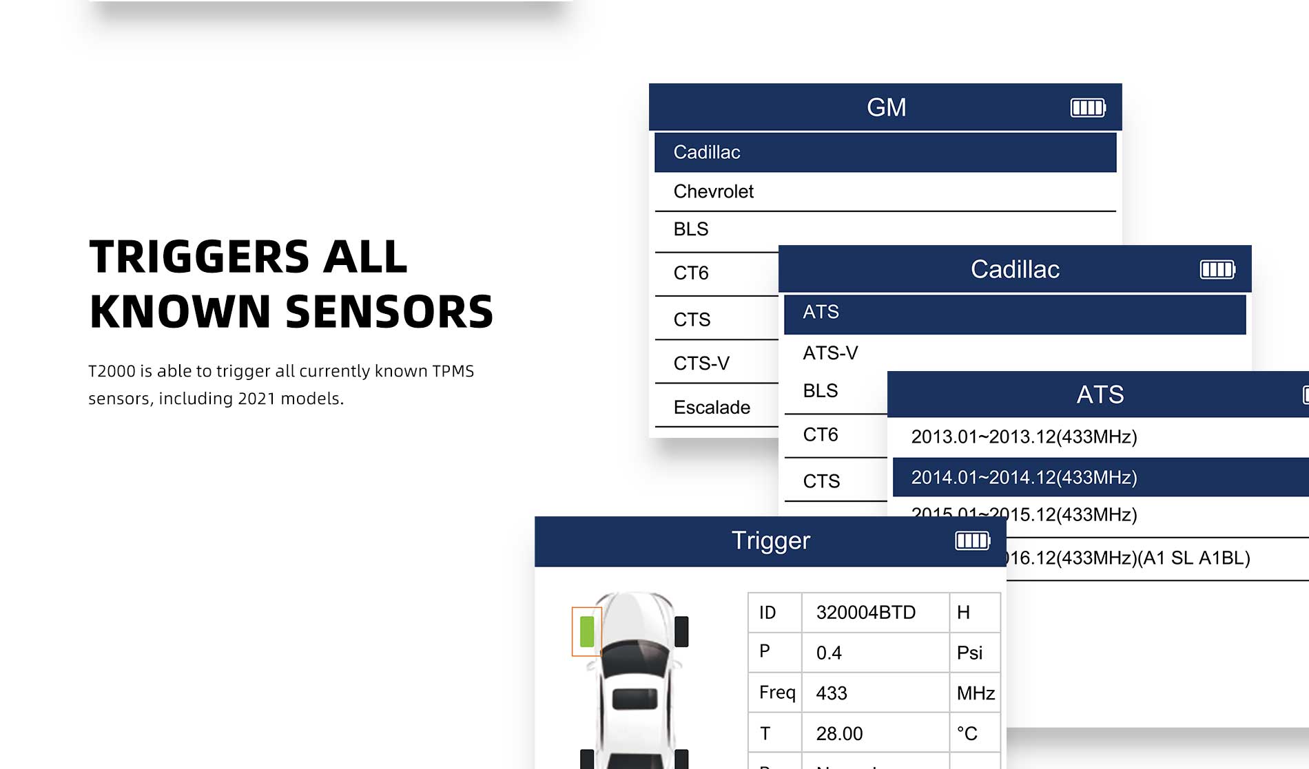 T2000 is a professional TPMS diagnostic and maintenance tool which can activate / decode universal TPMS sensors, program the T10 TPMS sensor and diagnose the original car tire pressure monitoring system. The T2000 provides a complete solution for TPMS servicing.