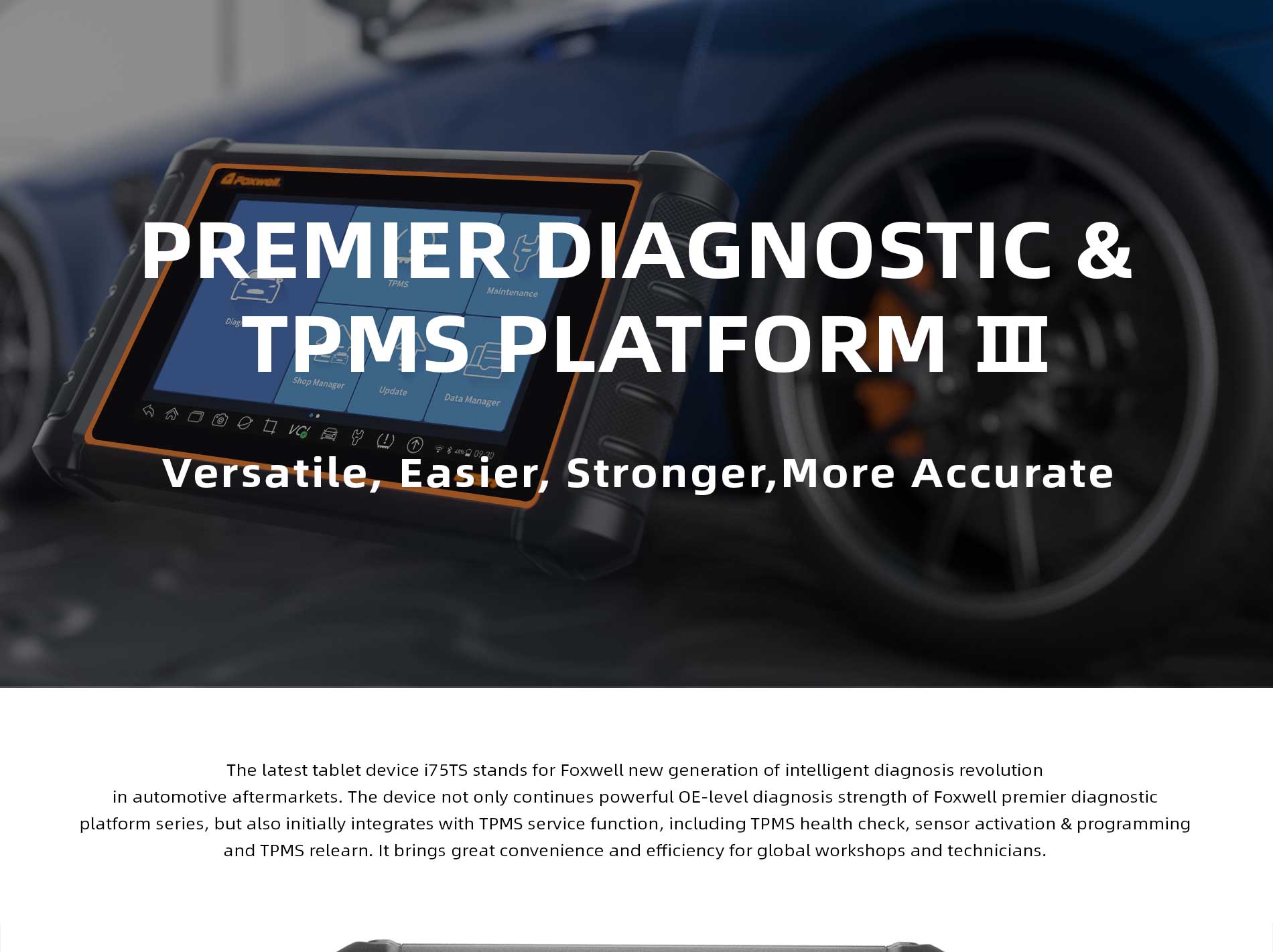 The latest tablet device i75TS stands for Foxwell new generation of intelligent diagnosis revolution in automotive aftermarkets. The device not only continues powerful OE-level diagnosis strength of Foxwell premier diagnostic platform series, but also initially integrates with TPMS service function, including TPMS health check, sensor activation & programming and TPMS relearn. It brings great convenience and efficiency for global workshops and technicians.