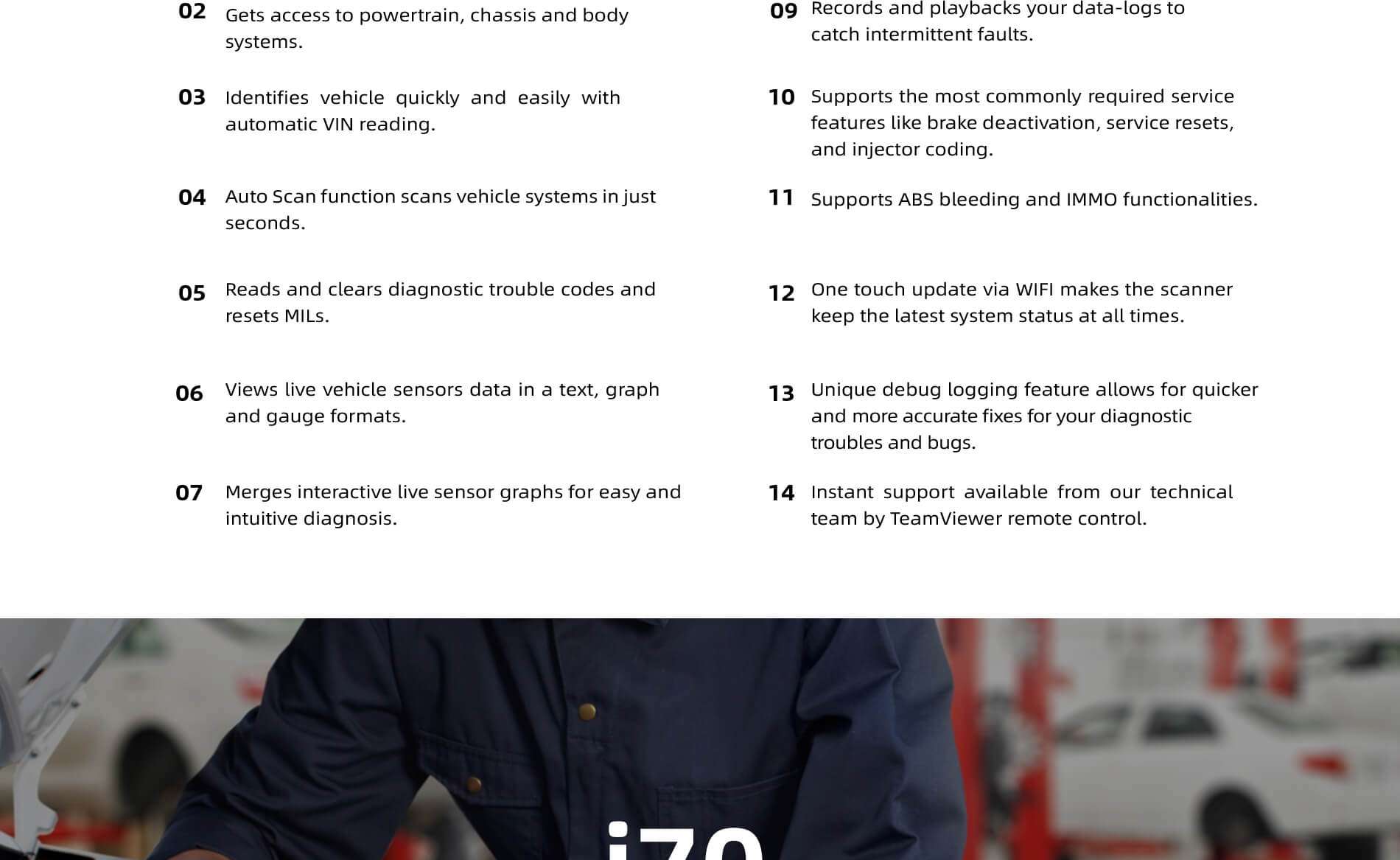 i70 inherits the same Foxwell advantages in car fault diagnostic tech, such as multi manufacturer coverage, service functions and accurate test data, making it the perfect tool for busy garages or workshops, who need the latest technology at unbeatable value.
