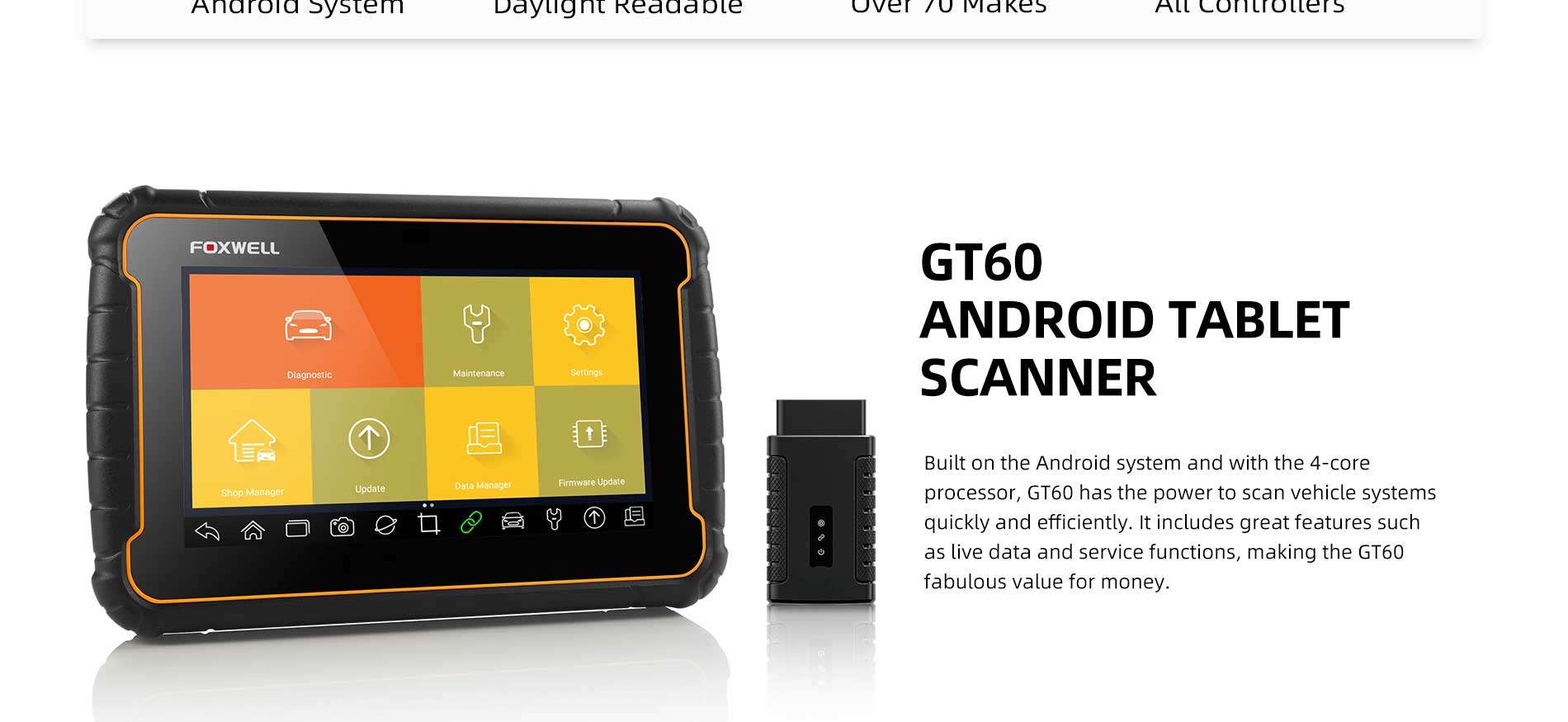 Built on the Android system and with the 4-core processor, GT60 has the power to scan vehicle systems quickly and efficiently. It includes great features such as live data and service functions, making the GT60 fabulous value for money.