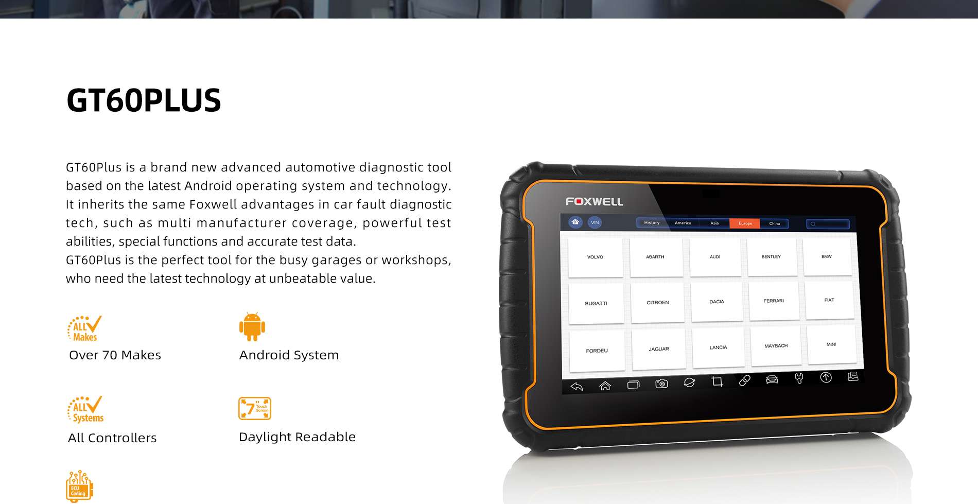 GT60Plus is a brand new advanced automotive diagnostic tool based on the latest Android operating system and technology. It inherits the same Foxwell advantages in car fault diagnostic tech, such as multi manufacturer coverage, powerful test abilities, special functions and accurate test data. GT60Plus is the perfect tool for the busy garages or workshops, who need the latest technology at unbeatable value.