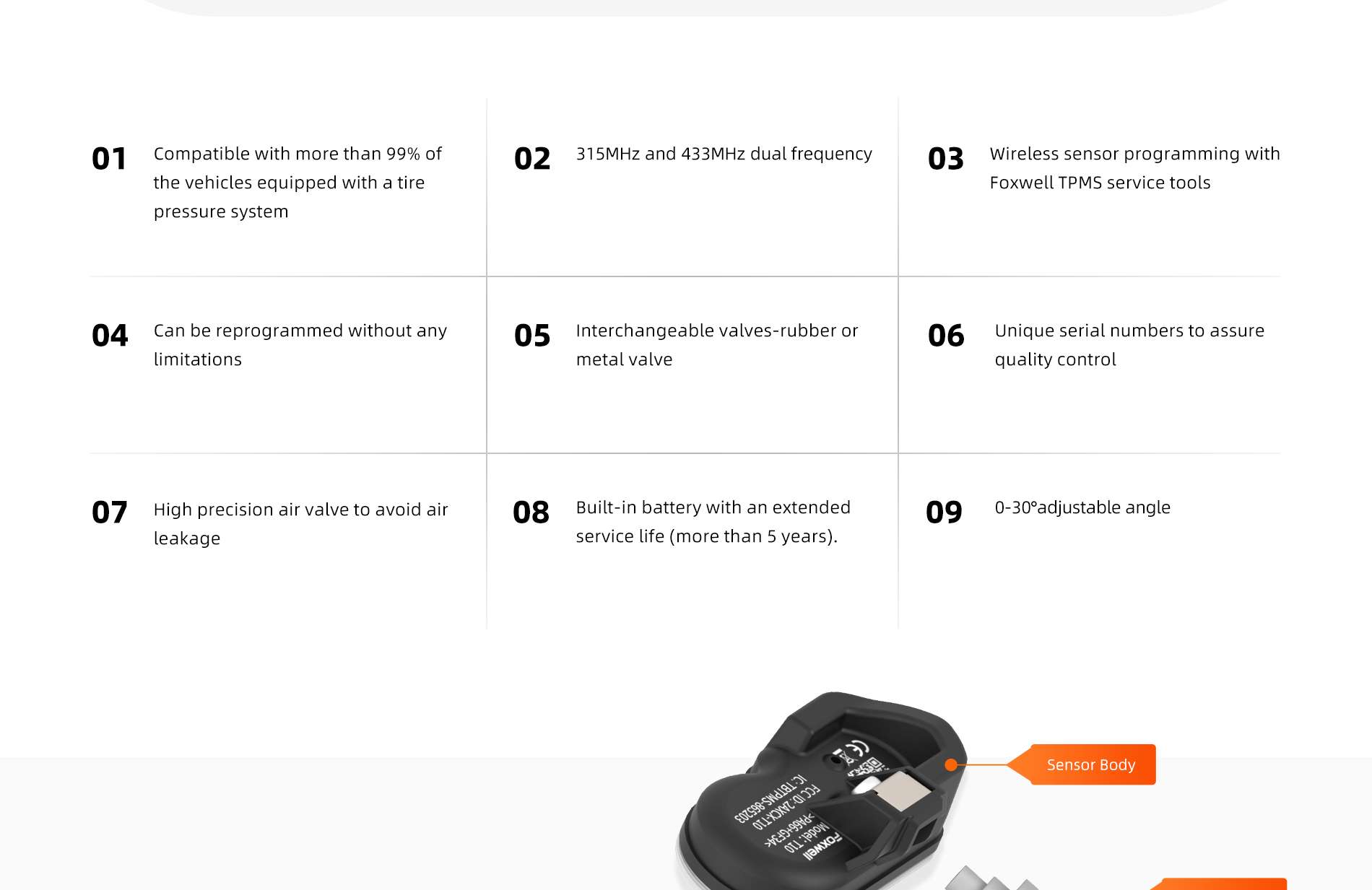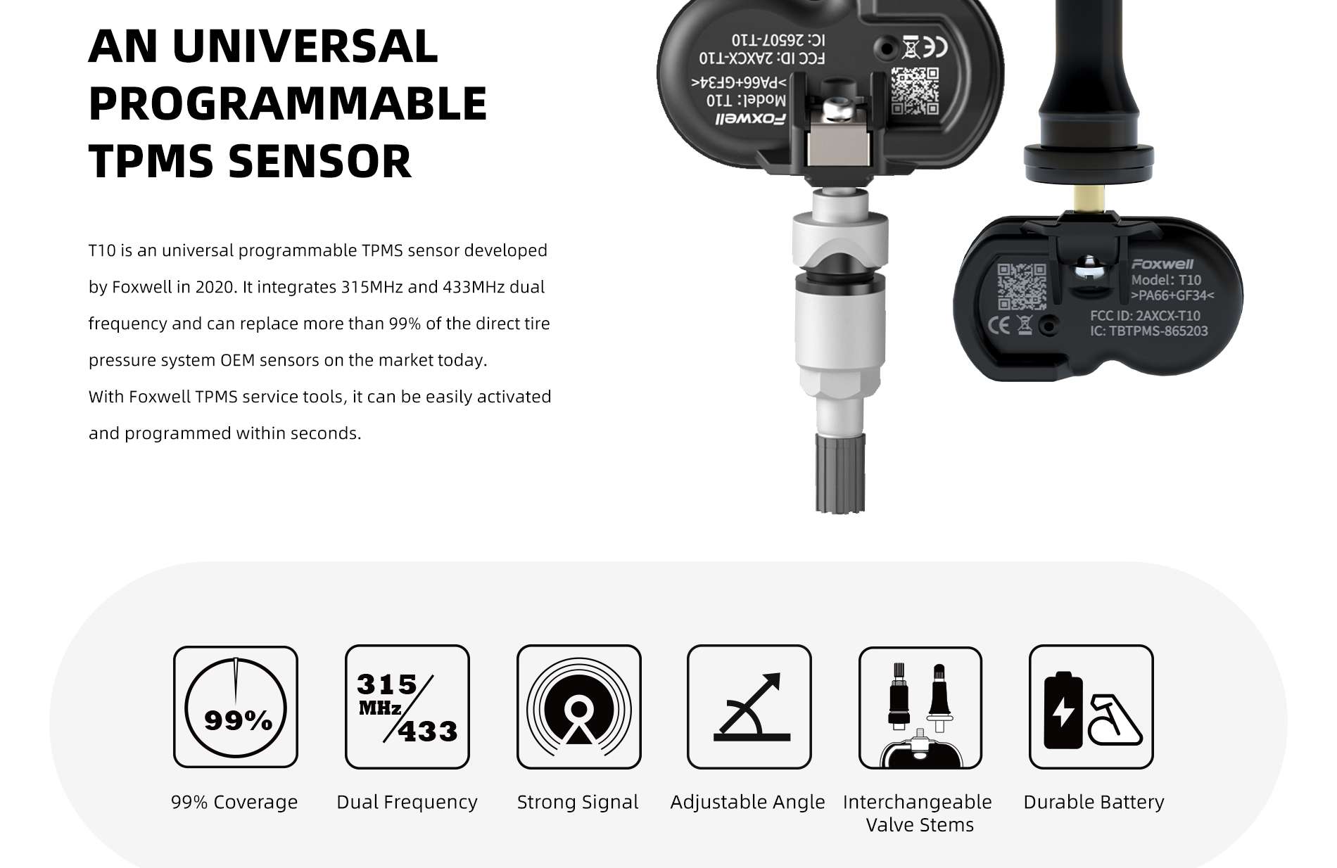 T10 is an universal programmable TPMS sensor developed by Foxwell in 2020. It integrates 315MHz and 433MHz dual frequency and can replace more than 99% of the direct tire pressure system OEM sensors on the market today. With Foxwell TPMS service tools, itcan be easily activated and programmed within seconds.